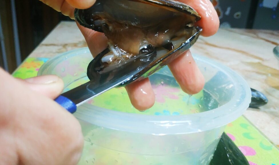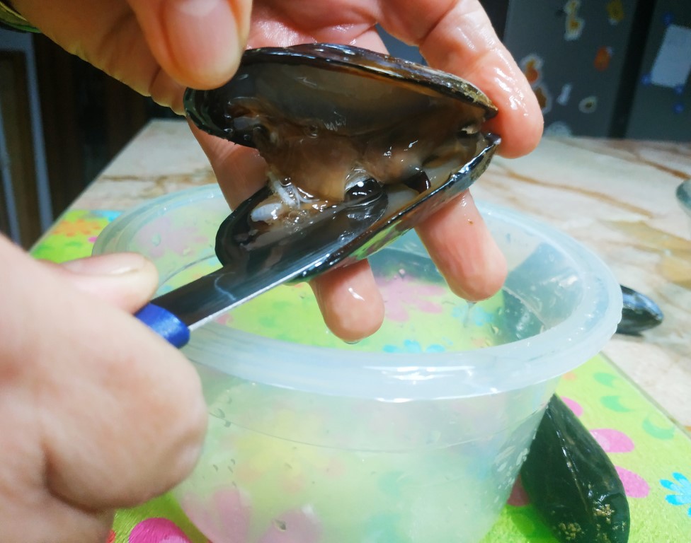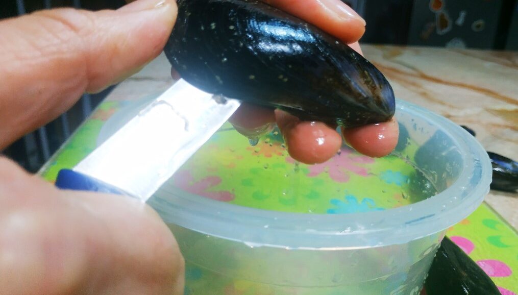 Una volta aperta la prima procedi fino all'ultima cozza, raccogliendo l'acqua che fuoriesce, che poi servirà per l'impasto.