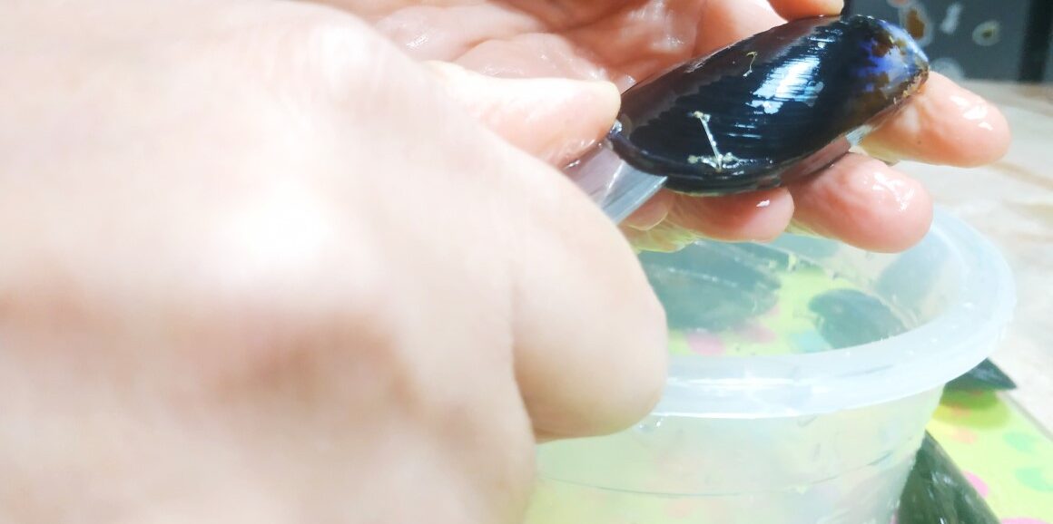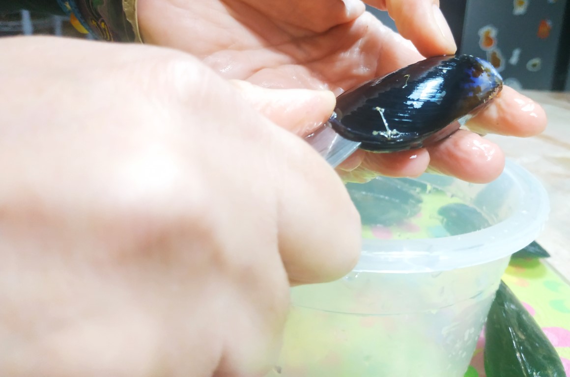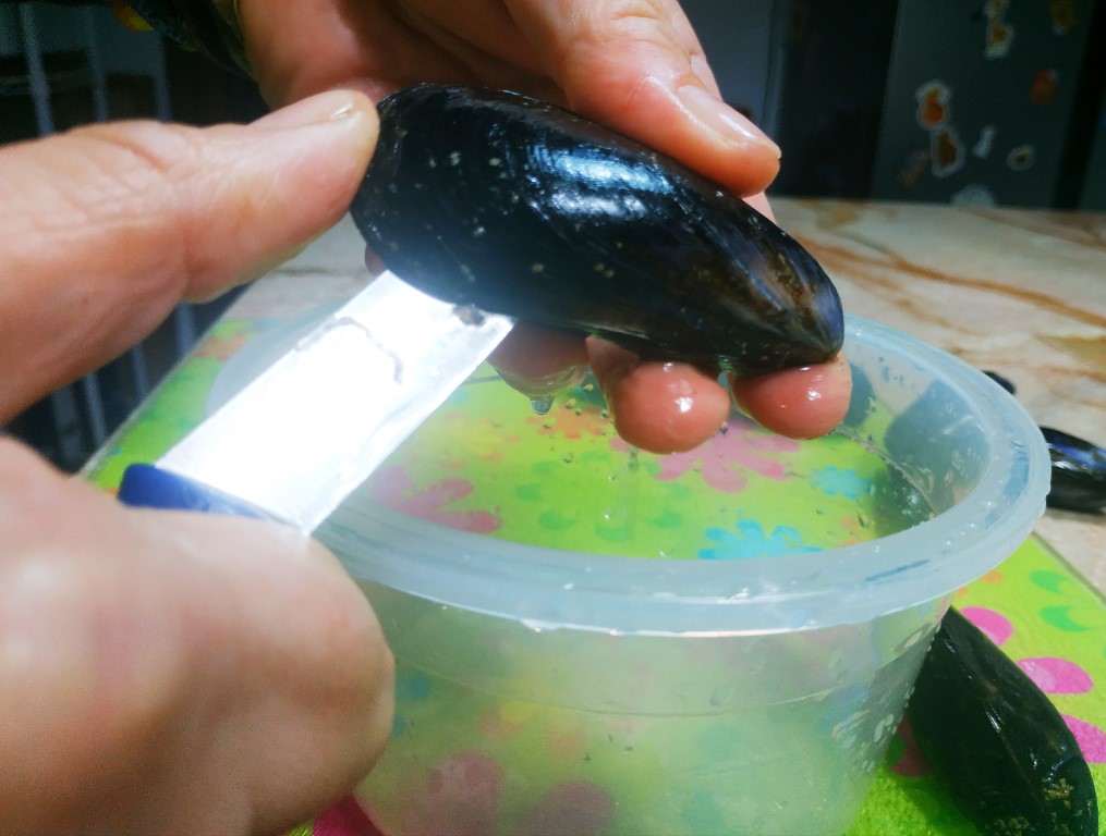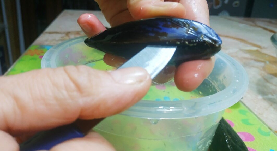 Procedi con l'apertura delle cozze. Prendi la cozza con la mano sinistra e fai fare un piccolo scatto in avanti al guscio superiore in modo da poter inserire più agevolmente il coltello. Infila il coltello tra le valve come in foto.