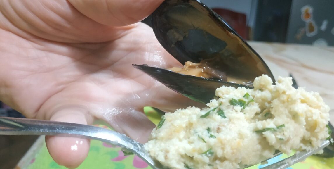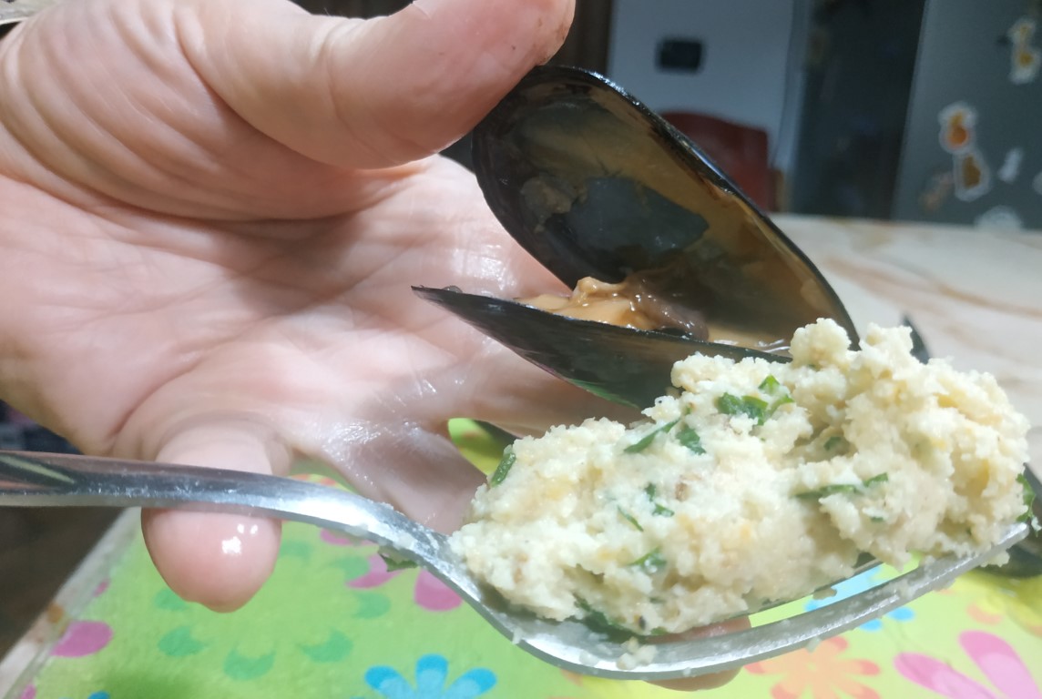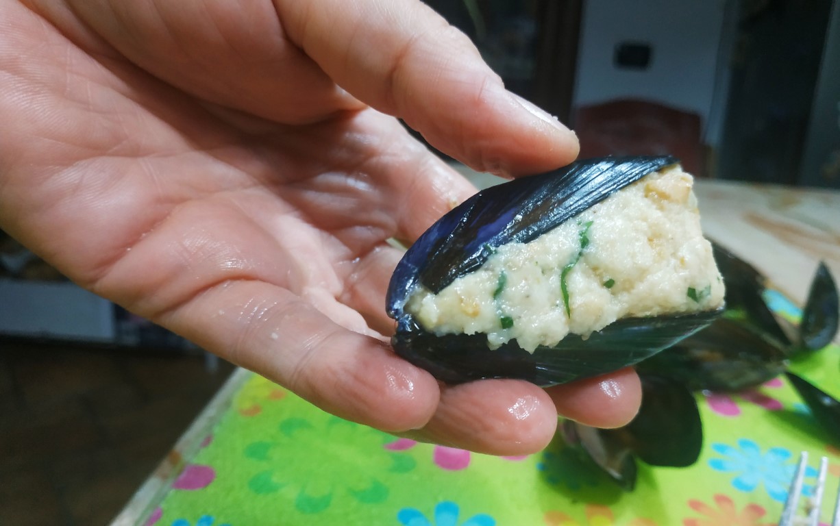 Con l'aiuto di una forchetta prendi un pò di impasto e inizia a riempire le cozze.
