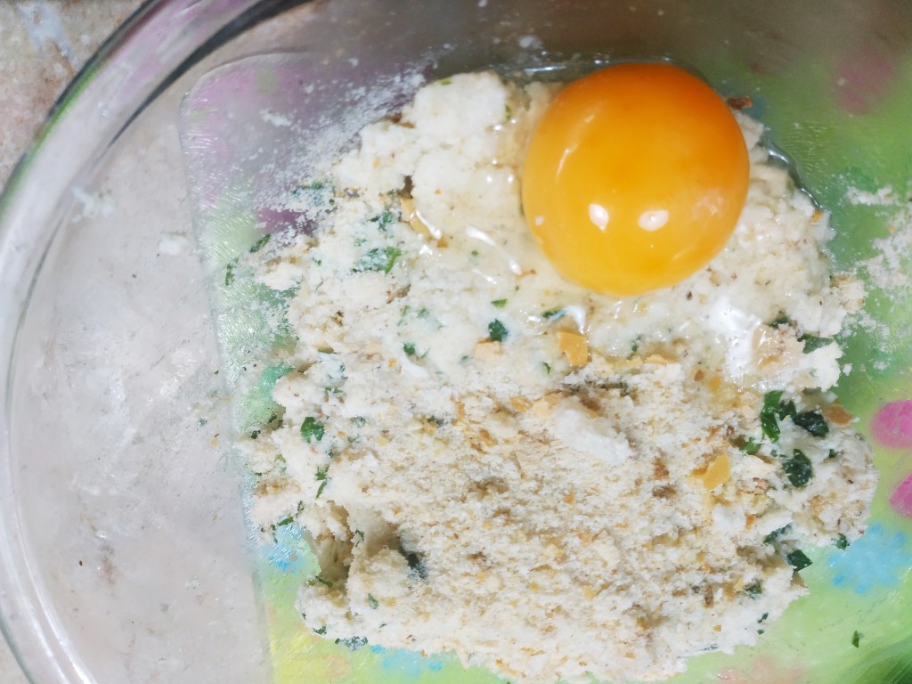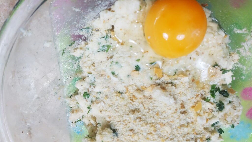 Prepara il ripieno. Nella bowl dove hai il pane raffermo ammorbidito, metti i formaggi grattugiati, il prezzemolo, il pepe, un po' di acqua delle cozze, il tuorlo e impasta. Infine metti un po' di pane grattugiato che asciugherà il composto rendendolo più compatto.