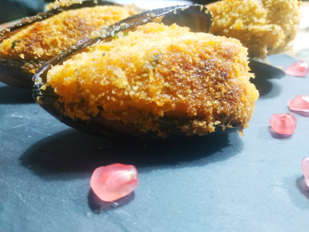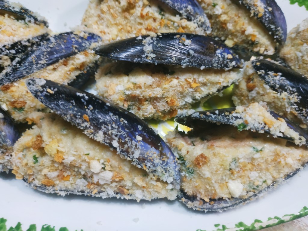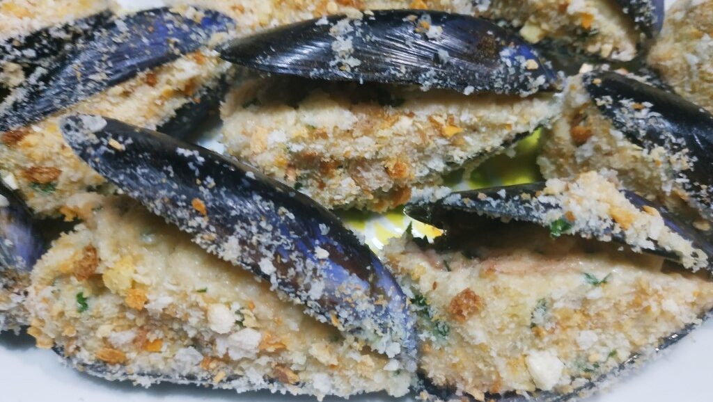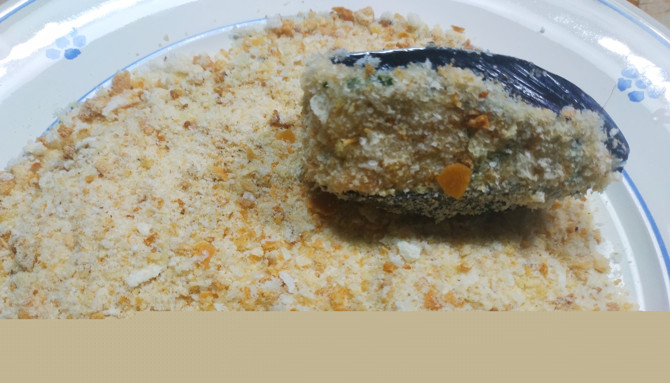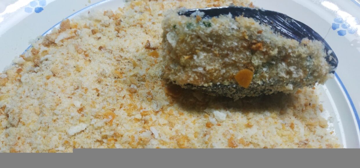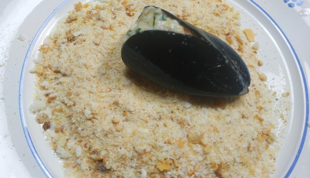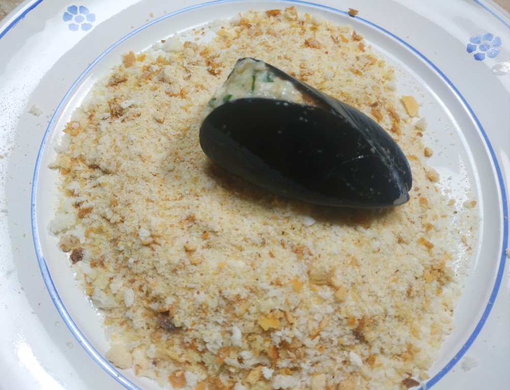 In un piatto metti il restante pan grattatato e adagia le cozze già riempite.